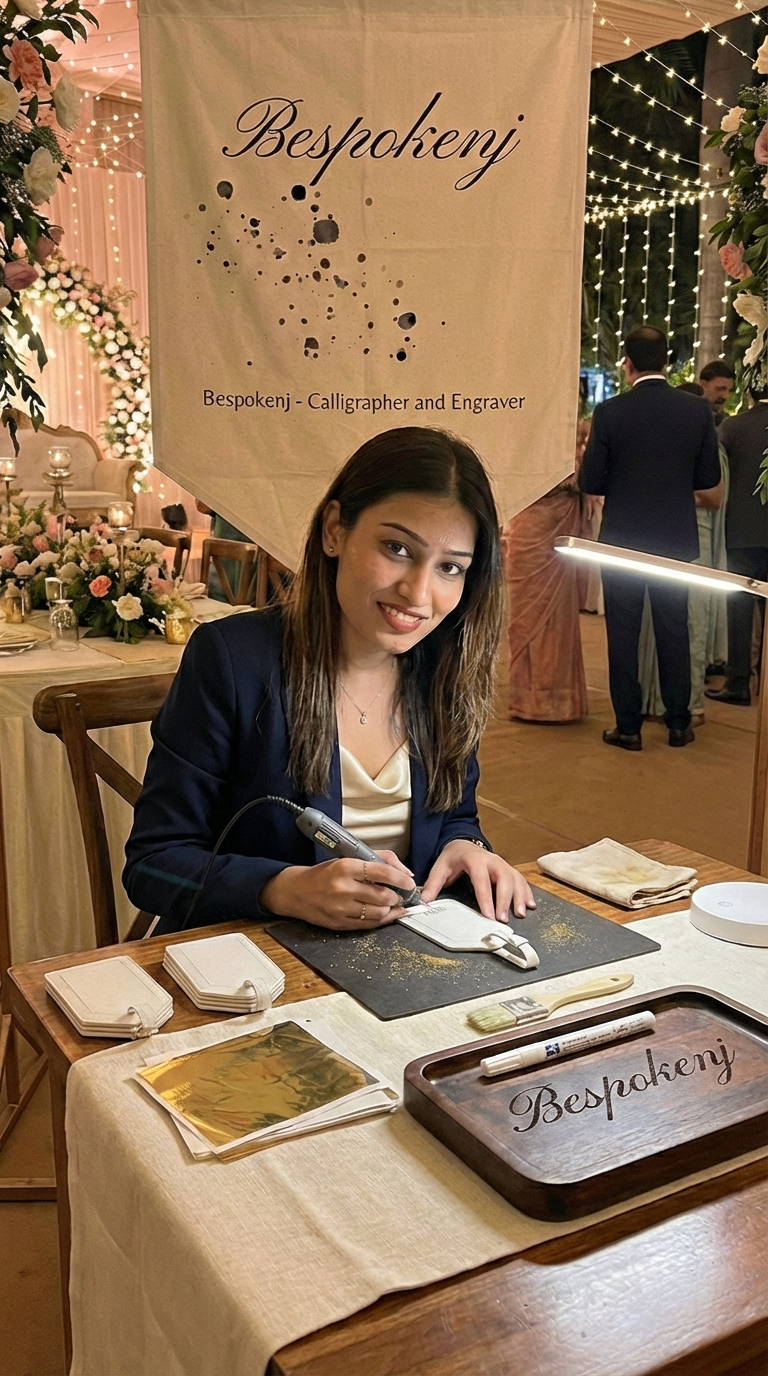 I’m Neha Jain. The best calligraphy and engraving artist in chennai. With a Master’s in Marketing and a passion for refined craftsmanship, I specialize in turning luxury gifting into a sensory experience. From precision engraving to live-event calligraphy, my goal is to create intentional details that do more than just look beautiful, they act as tangible memories that remain long after the final toast.”
